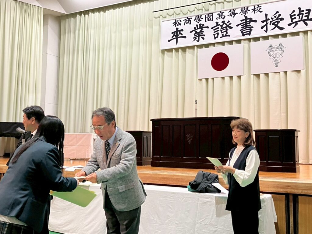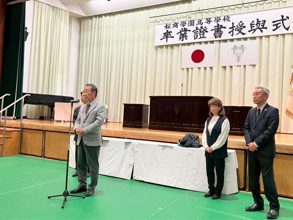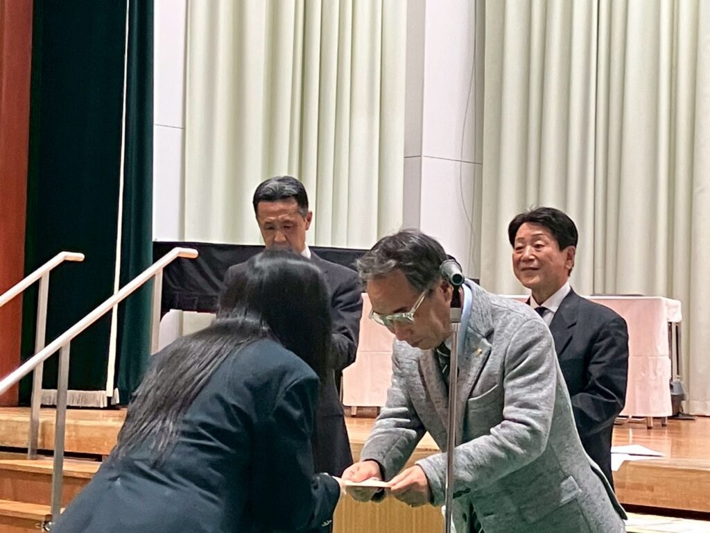 令和8年3月4日、卒業する3年生に対して校友会奨学金の贈呈式が行われました。卒業式が行われる体育館にて、恩田弘志会長より個々に手渡されました。