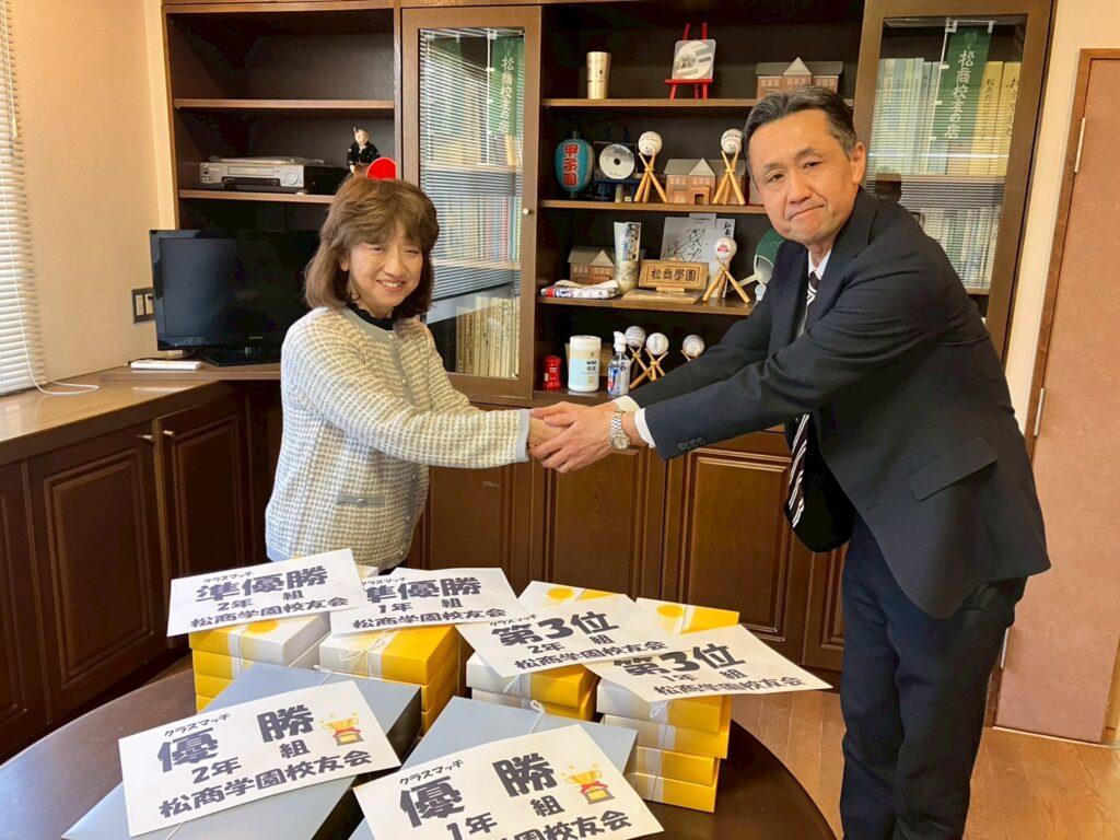 2026-03-17 活動報告 クラスマッチ景品の贈呈 ホーム 活動報告 クラスマッチ景品の贈呈 令和8年3月12日、13日とクラスマッチが行われました。 学年の上位3クラスに、校友会からの景品を小山副会長より森教頭先生にお渡ししました。 前の記事